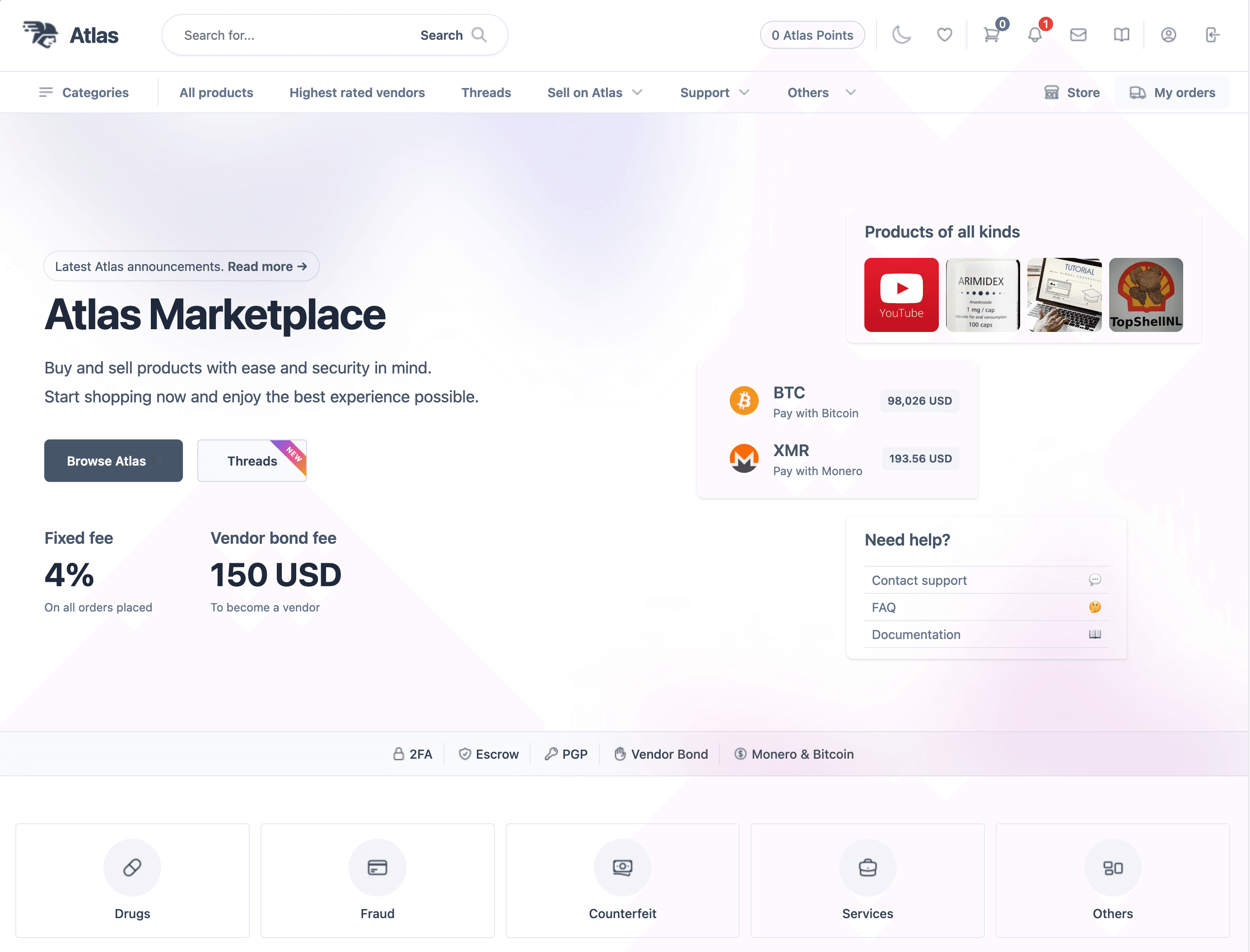 Launched in early 2023, Atlas Market quickly made waves in the darknet ecosystem as a clean, modern alternative to legacy marketplaces weighed down by technical debt, trust issues, or law enforcement infiltration. While little is definitively known about the creators of Atlas Market, rumors circulating on Dread and other darknet forums suggest that its operators are experienced vendors and developers who previously worked behind the scenes of defunct platforms. Their stated mission was to build a “resilient, community-driven market immune to the mistakes of its predecessors.”